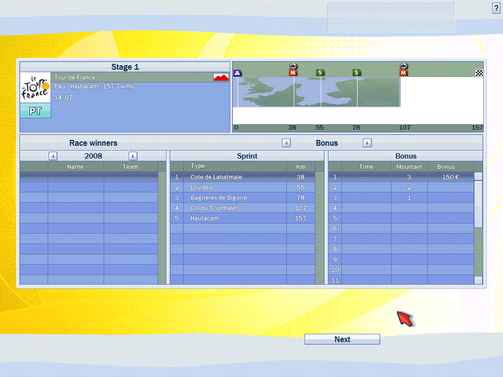 So I just installed latest update, and plus package with update patch, and everything works... except when starting a race the profile of the stage is always replaced with a map of europe! Attached is starting stage 10 of tdf 2008 up to hautacam. Also, in game I cannot see the route at the bottom of the screen, which makes things quite difficult. How do I fix this?