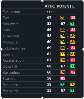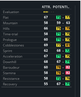 ]Hello, I am experiencing a strange buff in pro cyclist mode. When I create a classics puncher rider I get high potentials, but after simulating a few days my riders potentials drop a few points in every attribute. First picture is riders attribute after I create my rider. Second picture are my riders attributes after simulating a few days.