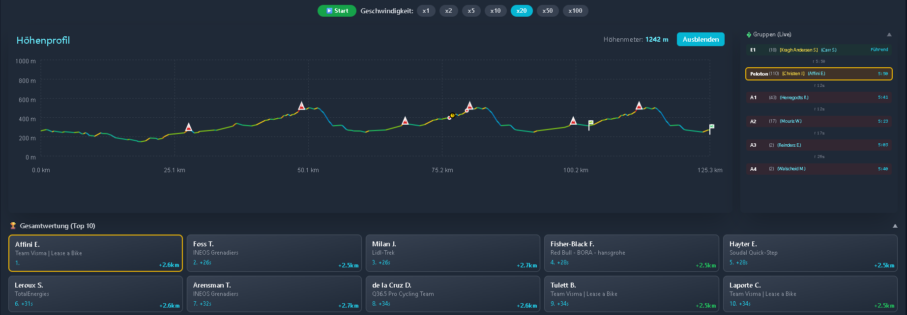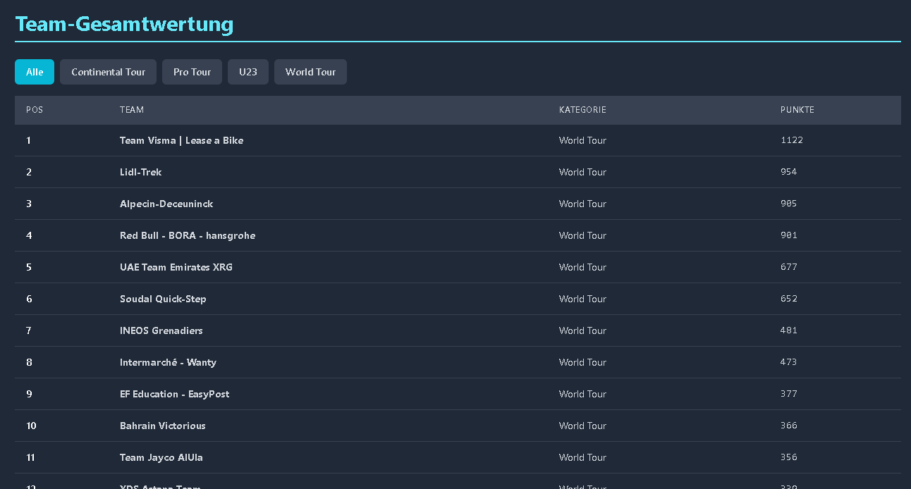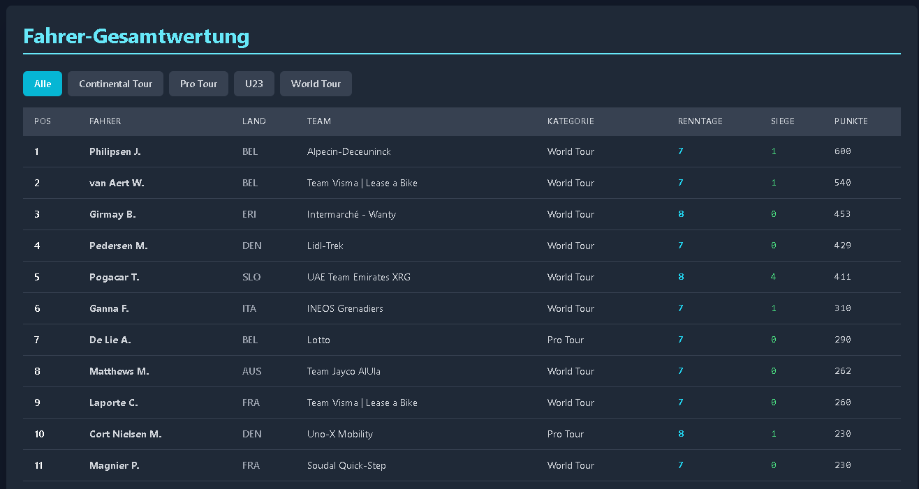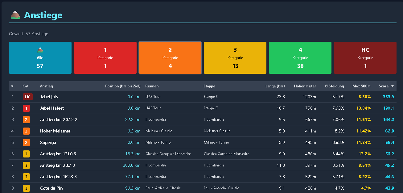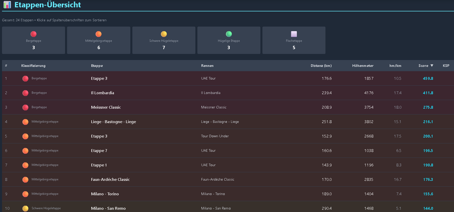 2. Stage Ranking: There are 9 Categories Flat -> Rolling -> Hill -> Hill Difficult -> Medium Mountain -> Mountain -> High Mountain / Cobbles - Cobbles - Hill each stage gets its score based on the profile. Hills, Mountains, Medium Mountains at the end of a stage getting higher scores. Steeper climbs get higher scores, longer climbs get higher scores and high mountain climbs get higher scors bases on ther elevation. All stages in the race get ranked in a certain Menu