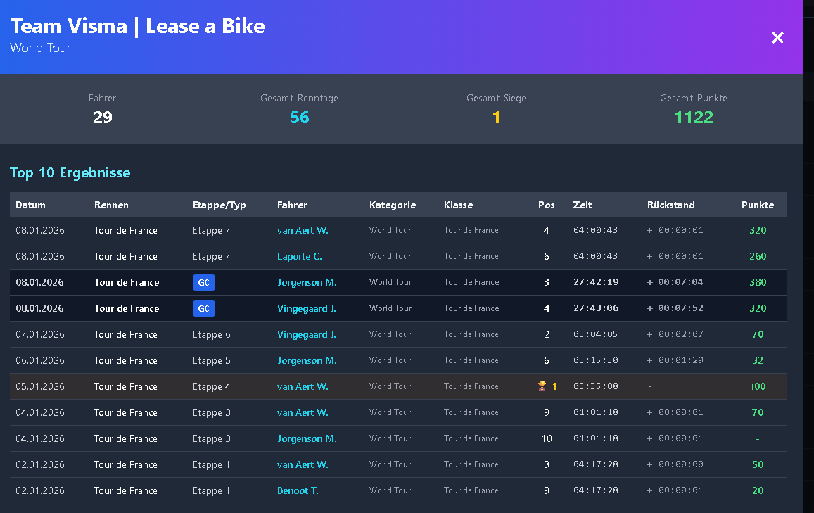 3. The same score calculation is used to rank each indiviudal climb in the game when it has a mountain classificaton. Duplicate climbs can have different scores based on their position in the race. A goal would be for me to track the fastest rider times for these climbs in the game and have a top 10 historical KOM Ranking for every climb. Working on this feature. At the moment there are climbs with name and without name. Stages and climbs are automatically ranked by the game and may need some fine tuning. Stage favorites are calculated at the start of each stage based on the stage category.