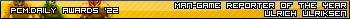 Reporter of the Year: Ulrich Ulriksen (76%); Runner Up: redordead (19%) As the reporting ranks have thinned, this has become an even harder award to decide because each and every one of the nominees (and several others) are vital to keeping MG running. That being said, Ulrich Ulriksen is the clear winner. Being a CT manager, it sometimes seems like he's the designated reporter for PT and PCT. GT's are no match for him, and the quality is always there too. Thank you Ulrich!