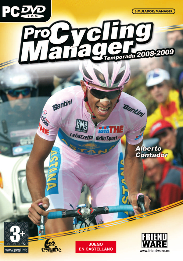 The spanish cover for Pro Cycling Manager 2008, featuring the national idol: Alberto Contador in pink TT gear at the Plan de Corones stage of the 2008 Giro.
