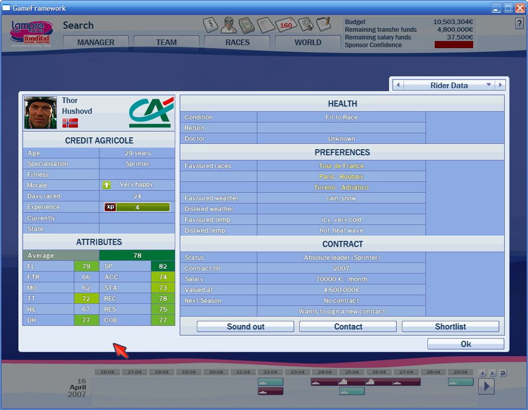 A screenshot of Thor Hushovd's stats which also shows us the new design of the rider boxes.