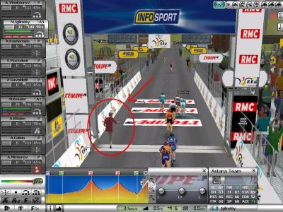 Its funny when fans do that. I once saw Didi the Devil cheer on the riders so much that he went waay past the finish line and got to where the riders all stop, as theres no more road.