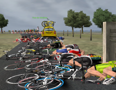 OmegaPharma rider turns around: "what the..." *mavic car crashes into him as well*
