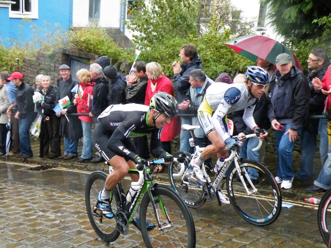 Russell Downing (Sky) and Matteo Carrara (Vaconsoleil) climbing Constitution Hill at the end of Stage 3 of the Tour of Britain. 23rd and 28th on the Stage.
