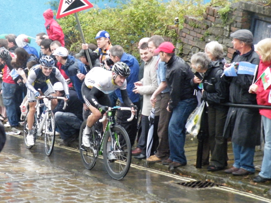 Race leader Greg Henderson (Sky) and Michael Golas (Vaconsoleil) climbing Constitution Hill at the end of Stage 3 of the Tour of Britain. 13th and 27th on the Stage.