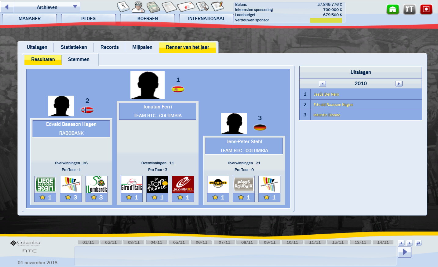 I don't know what the 2010 statts are doing there. I guess it's a little bug.. Because PCM crashed when i clicked on it. But these are the 2018 results with ferri winning Giro,tour and vuelta(only simulating) ;d