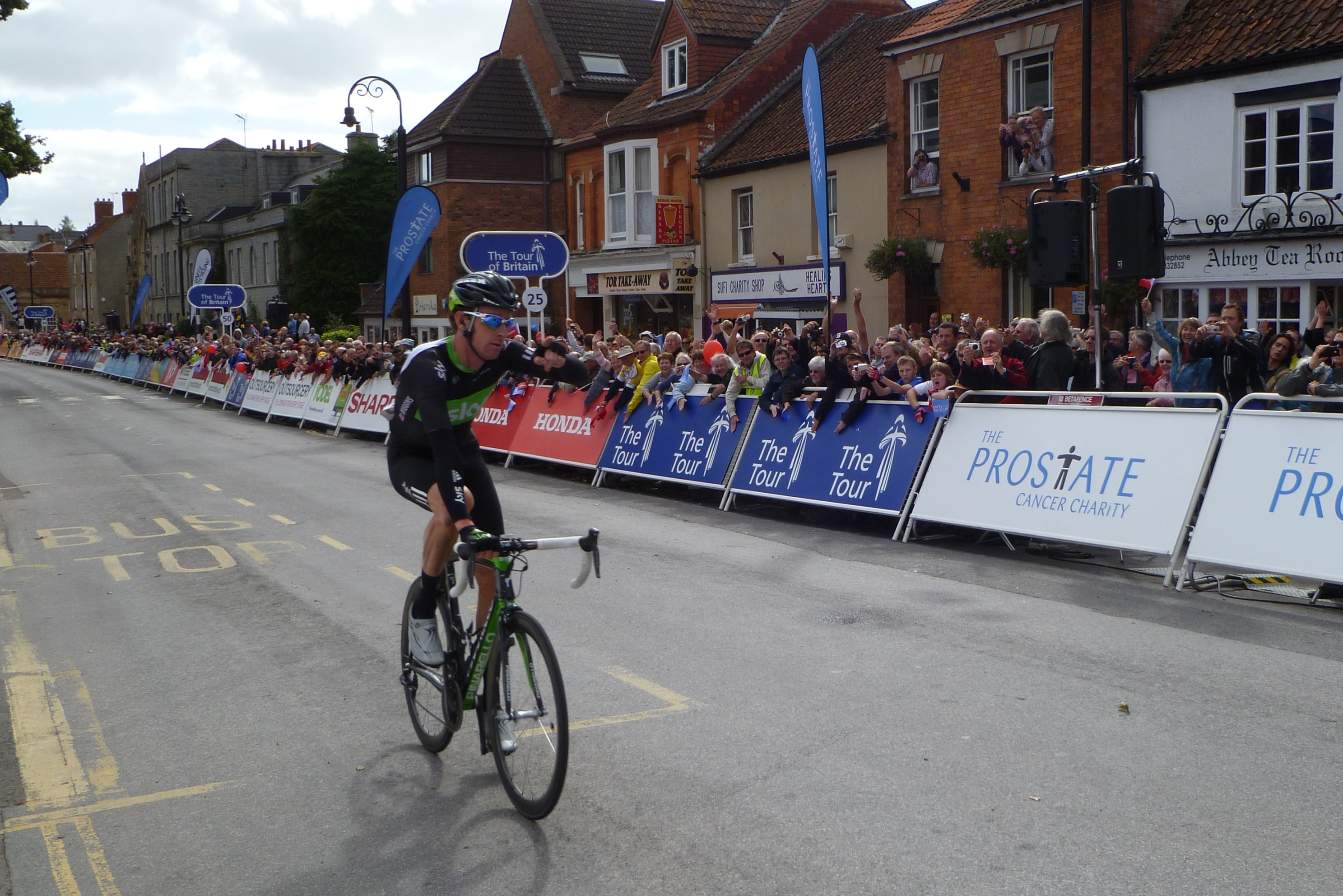 Bradley Wiggins salutes the crowd as he arrives 2nd from the succesful breakaway.
