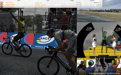 Wiggins finishes 3rd in the GC, only 32 secs behind A.Schleck. EBH wins 5 stages and the Green Jersey, moreover, Wiggins wins the TT in Grenoble and the whole team won the TTT, resulting in several days in yellow for Uran, Wiggins and EBH. In the end we also won the Team Classifications. It was my first GT on PCM'11, it took two months to complete and I played on hard ;)
