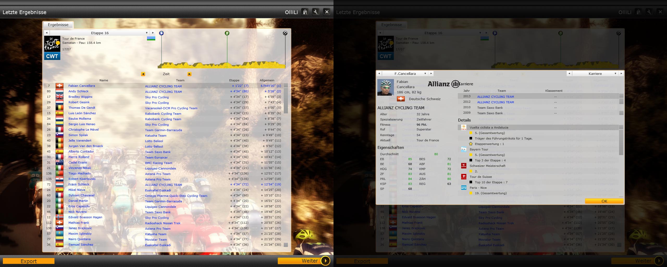 I'd the yellow jersey with Andy Schleck, and a Stage after a Win with Andy in the Mountains, i was with Spartacus in a Breakaway-Group. No one has made Work in the Peloton, so i have got the Yellow Jersey with Cance. After 2 boring Sprintstages, I decided to breakaway again with Cance, and again, no one has made work. That brings me another 3,5 Minutes.. At the last Mountainstage, i fail a lot, and Lost a 1&2 with Cance and Andy. Wiggins has win this Edition ...