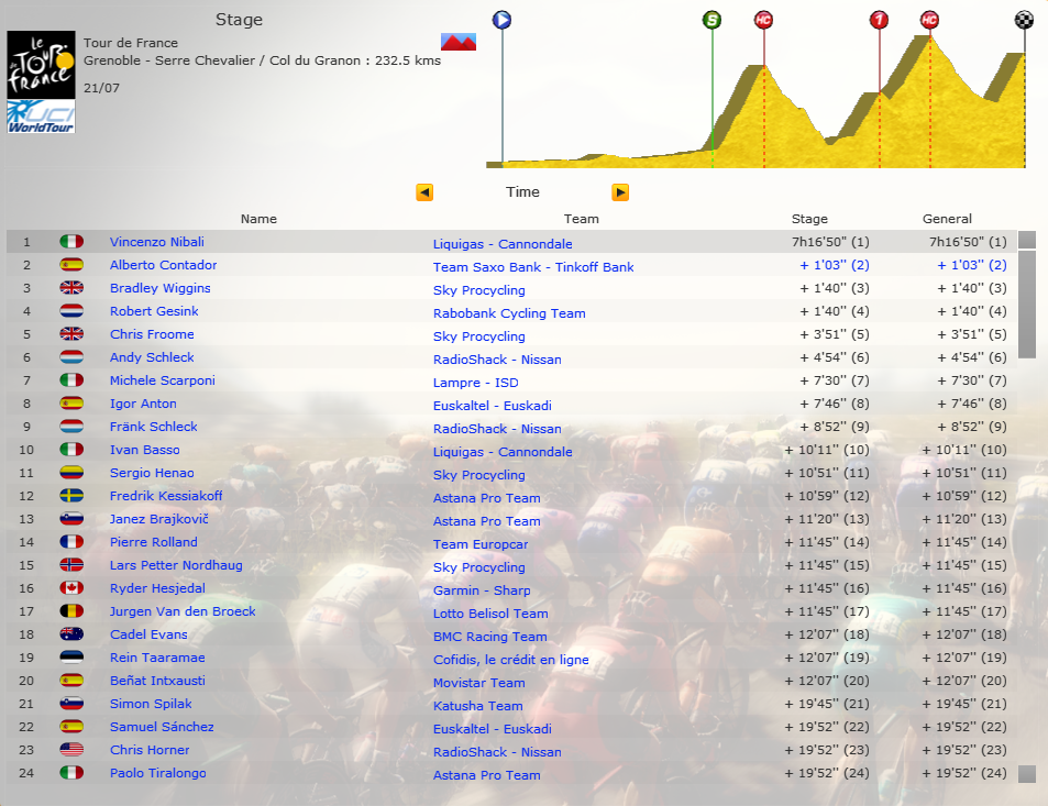 After going solo from the bottom of the Galibier, Contador got caught and dropped by Nibali with just two kilometers left. Crazy gaps behind.