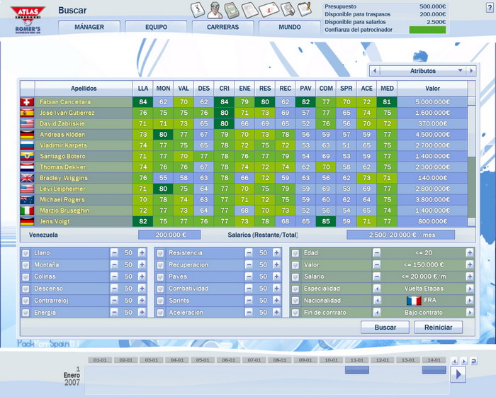 Regarding Cancellaras stats: They are vey good except two things: I think that he is a bit too high in TT because apart form the WC and Tour of Switzerland he hasn't impressed in longer tests. And he's sprinting stat should - in my opinion - be higher. I know his stage win at the tour wasn't exactly a bunch sprint one be he was up there and had the power to move away. And in the sprint Hunter won, he was second.