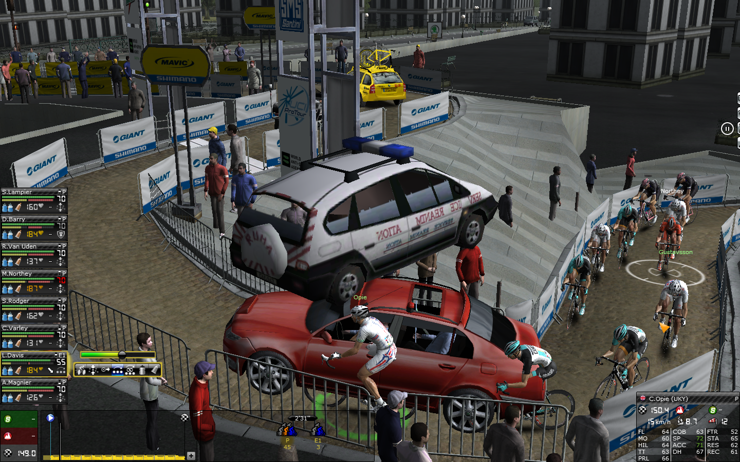This support car came rampaging through the peleton before limboing under a floating Italian police car and having Chris Opie stuck in the door.