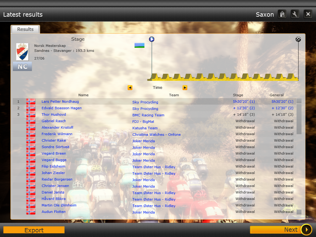 Nordhaug attacked at the second ascent of the day and was never been caught. I think this is a bug were the peloton stops pursuing the breakaways for the last 10K of the race.