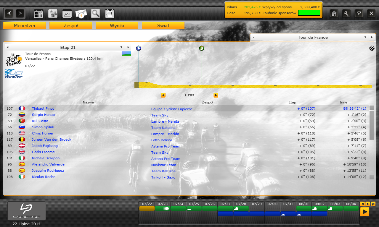 Pinot winning Tour 2014 in front of Henao and Costa... What a strange race that was. Quintana lost 25min on cobbled stage, Froome lost 10min on one of the Hilly stages. Henao took the podium after breakaway wich finished almost 10min before Peloton.... Reminds me little bit of Tour in 2006