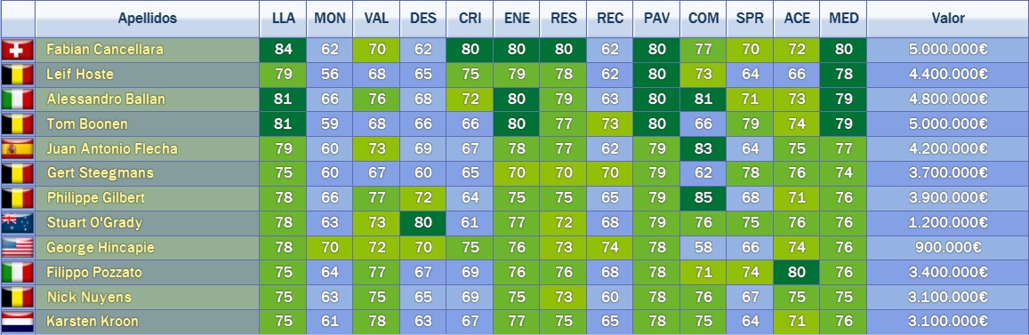 Perhaps raise the hilling stat on Cancellara by a few points. After all, he seemed to do a "lot" better on the hills than usual in both the San-Remo and Tirreno. But well, ofc lets see how he will handle them in Flandern classic.